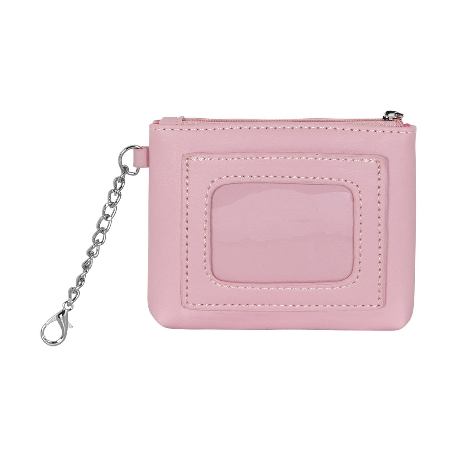 Geldbörse mit transparentem Kartenfach auf der Vorderseite. Hauptfach mit Reißverschluss und Innenfutter. Seitliche Kette mit Schlüsselring.