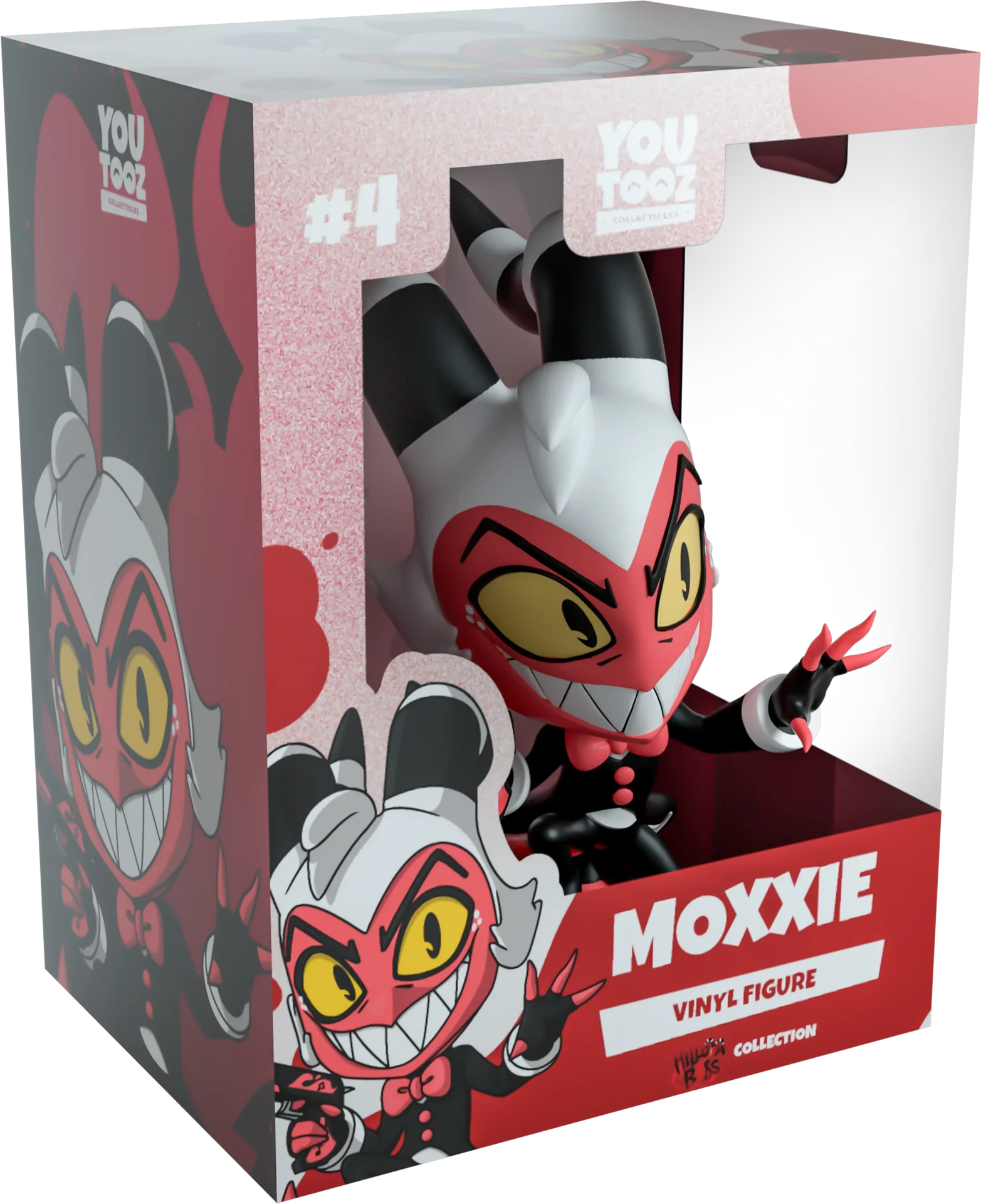 Ein Waffenexperte, ein Attentäter und vor allem ein geliebter Ehemann? Was mehr !? Oh Moment, natürlich ein Youtooz-Debüt! Und Moxxie ist niemand, der Sie enttäuschen wird! Er kauert 11,9 cm groß auf Huffüßen und hebt in seiner rechten Hand eine verzierte Pistole, während er mit der linken seine schlanken Finger ausstreckt. Ein scharfzahniges Lächeln breitet sich auf seinem geröteten Gesicht aus, während schräge Augenbrauen auf tiefgelben Augen ruhen. Zwischen seinen lockigen, gestreiften Hörnern und auf beiden Seiten seines Kopfes ragen Büschel weißen Haares hervor. Er trägt eine leuchtend rote Fliege und einen langen, fließenden schwarzen Mantel, der an den Enden fächerförmig ist, während sich ein langer, spitzer Schwanz darüber schlängelt Seite. Die Außenseite ihrer Verpackung zeigt eine dunkelrote Silhouette auf dunklem Hintergrund, während sie innen von braunen Streifen umgeben ist, die an schmutzige Tapeten erinnern. Die Schutzhülle ist dann mit schwarzen und weißen Diagonalstreifen verziert und mit dem „Helluva Boss“-Logo bedruckt, dessen Silhouette durch das große transparente Sichtfenster auf der Vorderseite sichtbar ist. Dieses Sammlerstück wird in einer schützenden, geprägten matten Außenhülle und einer maßgefertigten Kunststoffschutzhülle für maximalen Schutz während des Versands geliefert.