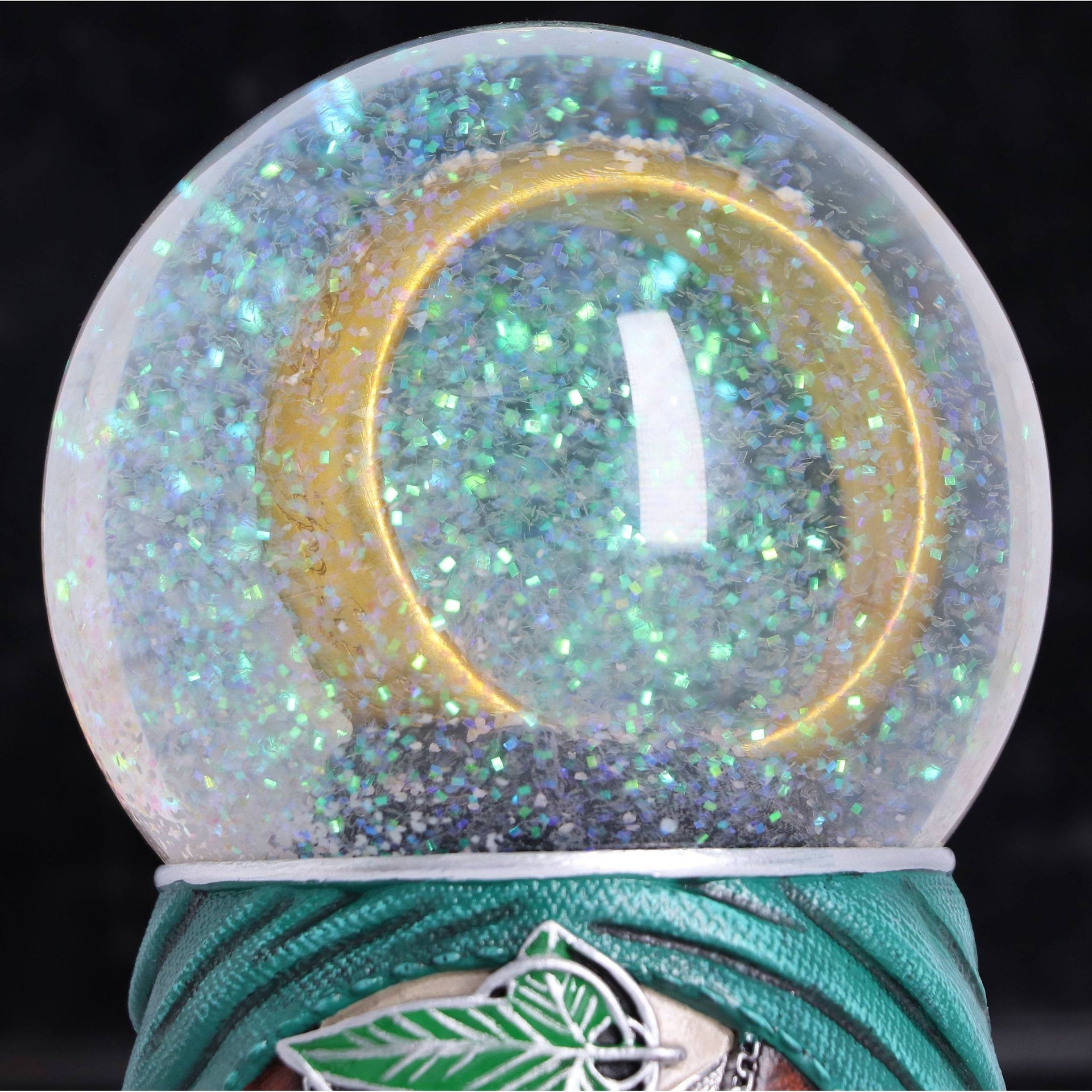 The base of this beautifully designed snow globe is formed by Frodo's green cape, the front of his brown button-down blazer and his off-white shirt. The iconic Lorien leaf is placed just below the top edge and makes the perfect centerpiece. On the back it bears the quote "Even the smallest person can change the course of the future." Inside the globe, the One Ring takes center stage, surrounded by the inscription "One Ring to Them All." This exquisitely designed piece is cast in the finest "elven" resin before being hand painted by experts.