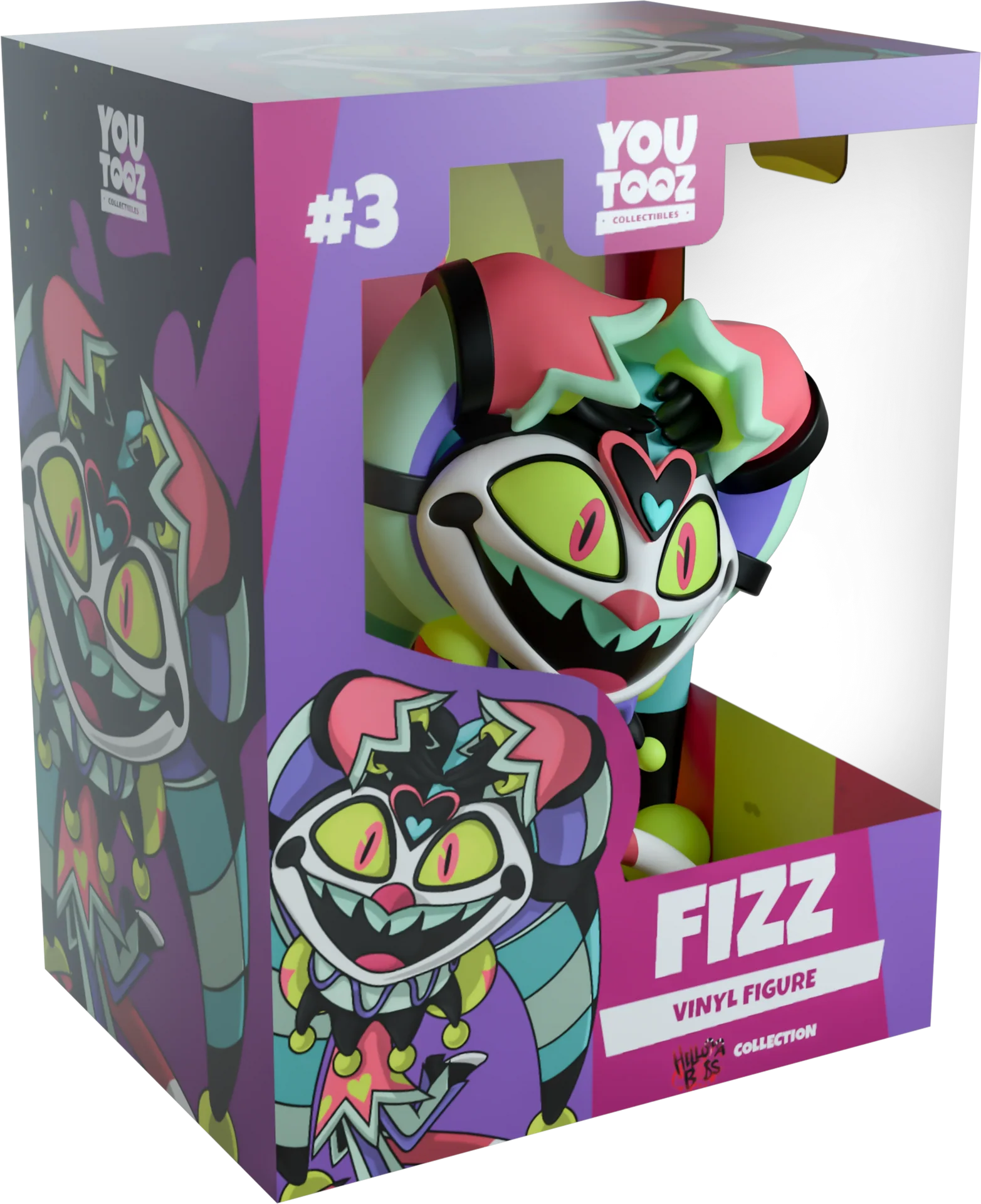 It's time for a performance so good it could very well be our last with the grand entrance of Fizz on Youtooz! With arms wrapped around a maniacally grinning face that has bright green eyes and a heart on its forehead, two thick striped tips of his jester hat fall down with a pair of balls resting on the ground as he stands 4.8 inches tall with a leg kick behind him. Dressed in an outfit of vibrant purples, pinks, greens, and yellows, bells hang from the black points of his collar while hearts line the waistband of his top above striped pants and a long, pointy tail curls around his front. The outside of their packaging features a bright purple silhouette against a dark background, while the inside surrounds them with pink and yellow stripes and is reminiscent of dirty wallpaper. The protective sleeve is then adorned with pink and black diagonal stripes and printed with the "Helluva Boss" logo as their silhouette is visible through the large clear display window on the front. This collectible comes in an embossed matte protective outer sleeve and a custom-sized plastic protector for maximum protection during shipping.