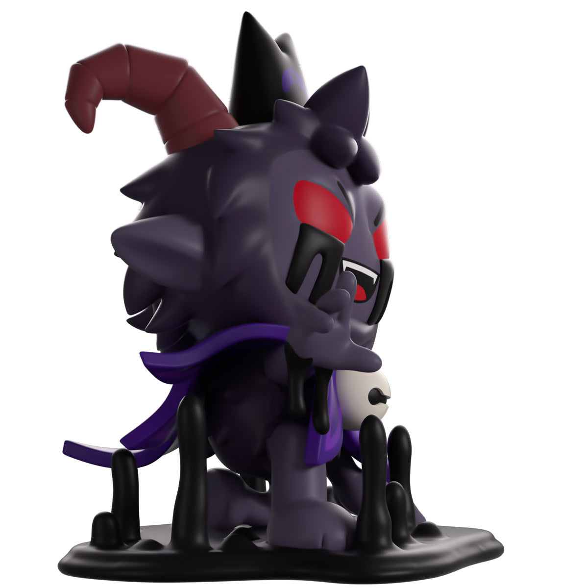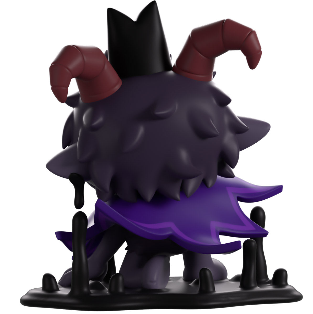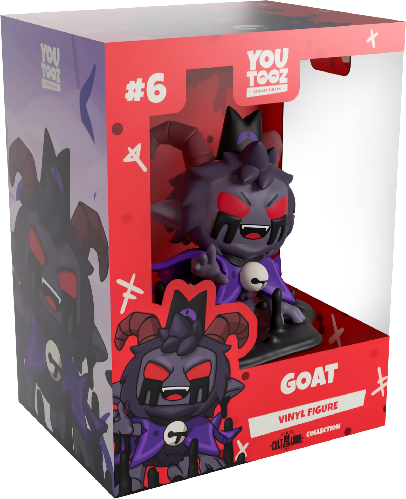 Looking after your flock can be difficult, and sometimes you need a helping hand! But don't worry, the Goat has heard your bleating and is here to help with its Youtooz debut! Kneeling, at 9.7 cm, they emerge from a pool of black matter that rises in thick tendrils around them. They hold one hand outstretched, the other placed on the ground near their feet, while a pointed purple cape floats over their bodies. With an evil smile and black streaks descending from their bright red eyes, they wear a purple crown between two curly brown horns and a silver bell around their neck. The outside of their packaging depicts a statue of a Lamb dripping with black matter. The inside is a vibrant bloodstain, dotted with symbols, on an off-white background. The protective sleeve echoes this off-white hue, with crosses and chains anchored to the ground and pulled towards the sky, their silhouettes visible through the large transparent window on the front of the packaging. This collectible was designed in collaboration with @therealracckun and comes in a matte, embossed protective sleeve, as well as a custom-made plastic protector for optimal protection during transport.