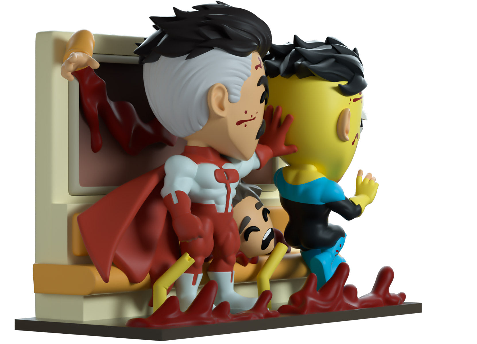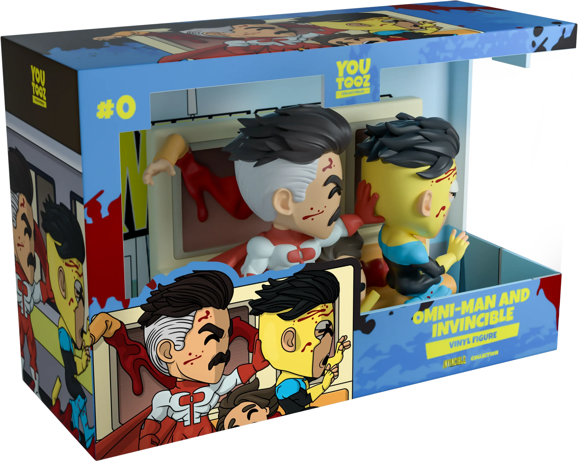 The battle between Omni-Man and Invincible rages on Youtooz, leaving a trail of devastating destruction in its wake! Standing at just 12.5 cm tall, Omni-Man confronts us, and Invincible, with the fragility of human life. Standing firmly, he grips the back of Invincible's head, forcing him to watch helplessly as carnage erupts around him, covering the train car in a sea of ​​blood and dismembered limbs. His muscular body is visible through a tight-fitting red and white suit, and blood streams down his stern, chiseled face. His long cape billows behind him as Invincible, panicked, helpless, and defeated, raises his hands in vain, unable to do anything to stop the ongoing slaughter. Blood stains his blue, yellow, and black body and surrounds the shattered right eye of his mask. The outside of their package watches the horrific scene unfold from outside a train car. The interior features a pristine cityscape beneath a bright blue sky that extends across the protective sleeve, while the characters are visible through the large transparent window on the front of the packaging. This collectible comes in a matte, embossed outer sleeve, as well as custom-fitted plastic protection for optimal shipping safety.