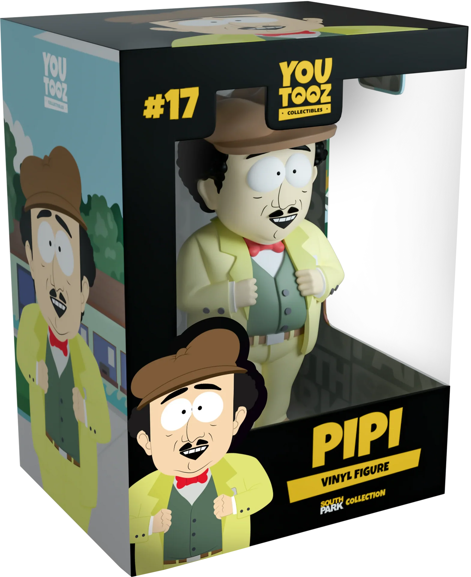 Name someone less affected by pee, go on, I'll wait. Measuring 4.7 inches tall, THE PiPi, owner of PiPi's Splashtown, is making waves (water waves, perhaps) with his Youtooz debut! Standing 4.7 inches tall, Pipi is dressed as always in a matching yellow suit for his jacket and pants, while underneath he wears a green jacket and a vibrant red bow tie. On top of his head is a brown hat that matches his brown dress shoes. Both of his hands are clutched on either side of his yellow jacket. The exterior of its double-walled packaging depicts the entrance to Pipi's Splashtown. The interior is the South Park logo repeating on a grayscale pattern. The slipcover shows Cartman, Stan, Kenny and Kyle watching from the corners against a black background. This collectible comes in an embossed protective matte outer sleeve and a custom-sized plastic protector for maximum protection during shipping. shipping.