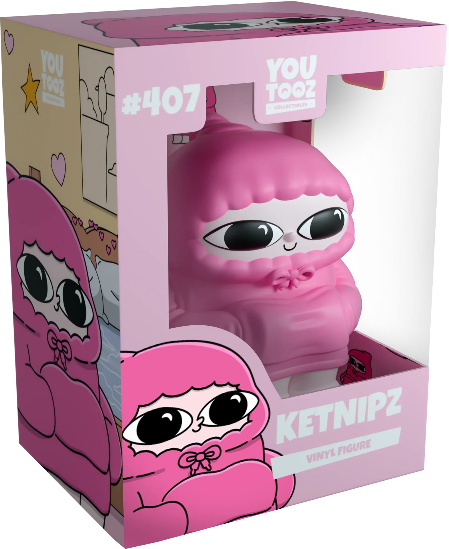 Ne faites pas attention à moi, je ne suis qu'un haricot sans genre et douillet. Ketnipz mesure 3,5 pouces, les jambes repliées sous son sweat à capuche rose. Leurs mains se cachent dans la pochette du sweat à capuche. Tandis que le cordon est serré et noué dans un joli nœud. La boîte de présentation vitrée a été illustrée montrant Ketnipz dans leur chambre. Ils sont assis dans un nid de couvertures et d'oreillers, entourés d'animaux et de linge. Leur ordinateur est posé devant eux, avec la lumière qui les éclaire pendant qu'ils mangent de la glace. L'intérieur de la boîte montre Ketnipz dans de nombreux sweats à capuche colorés, assis et posant dans différentes positions comme un motif sur la boîte. La pochette de protection a été décorée d'un ciel bleu clair moucheté de nuages blancs duveteux. Cet objet de collection est livré dans une pochette extérieure de protection mate en relief et dans un protecteur en plastique de taille personnalisée pour une protection maximale pendant l'expédition.