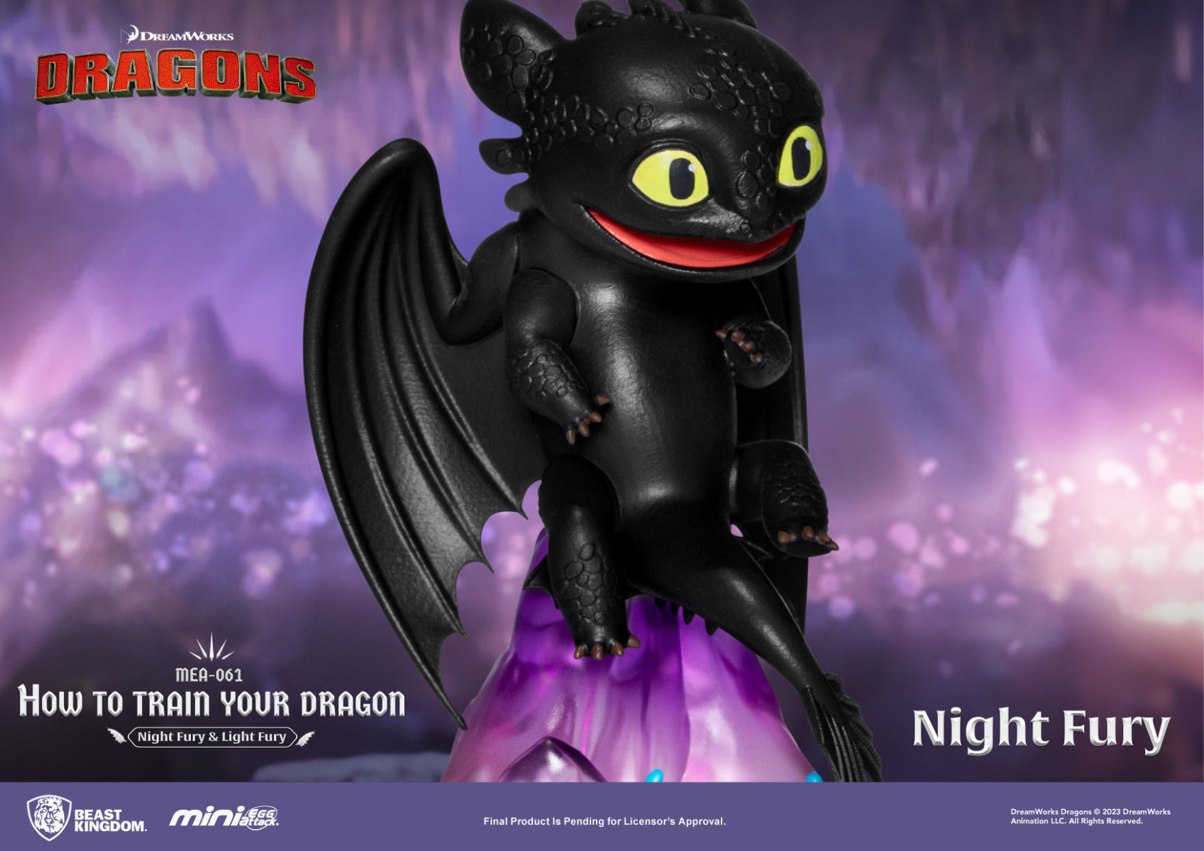 Pour célébrer les aventures passionnantes de « Comment dresser votre dragon », le couple Lightfury et Nightfury prend vie avec la sortie d'une série Mini Egg Attack (MEA) de 3 pouces de la « marque Entertainment Experience » de Beast Kingdom. Cette collection en double pack version Q recrée fidèlement la douce scène du couple volant dans les airs, se regardant. Connectez les deux mini-figurines pour former la forme d'un cœur. C'est une reconstitution à la fois merveilleusement douce et passionnante de deux redoutables dragons en vol. Le sol est rehaussé d'améthyste et de cristaux rouges.