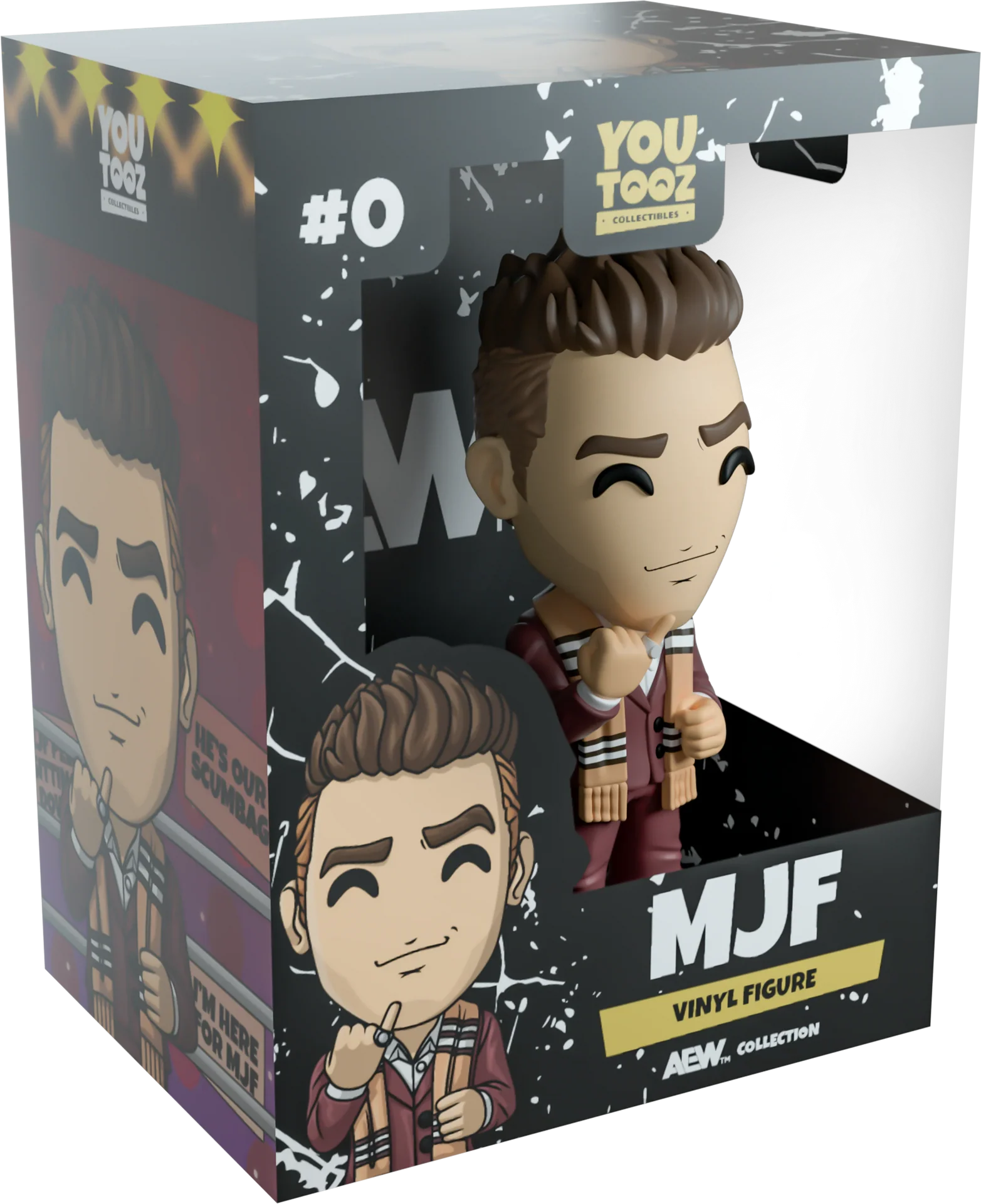 Ce chiffre est meilleur que vous et vous le savez ! MJF se tient prêt pour un grondement mesurant 4,8 pouces et est habillé pour impressionner, vêtu d'un costume rouge foncé bien ajusté avec une longue écharpe qui pend librement autour de son cou alors qu'il le tient sur le côté avec sa main gauche. Sa main droite est levée en un poing avec le petit doigt pointé vers sa bouche tandis que son beau visage ciselé et souriant est couvert d'une légère ombre de 17 heures et de cheveux bruns parfaitement coiffés. Sa vitrine vitrée a été illustrée pour montrer un ring de lutte éclairé par des projecteurs avec un public animé en arrière-plan alors qu'il se tient sur les cordes, s'imprégnant de l'amour du public et exhibant son corps parfait. Tandis que l'intérieur a été conçu avec un motif blanc sporadique moucheté sur un fond noir qui se poursuit sur la pochette de protection alors que sa silhouette est visible à travers la grande fenêtre transparente située à l'avant. Cet objet de collection a été conçu en collaboration avec le membre de la communauté @therealracckun et est livré dans une pochette extérieure de protection mate en relief et un protecteur en plastique de taille personnalisée pour une protection maximale pendant l'expédition.