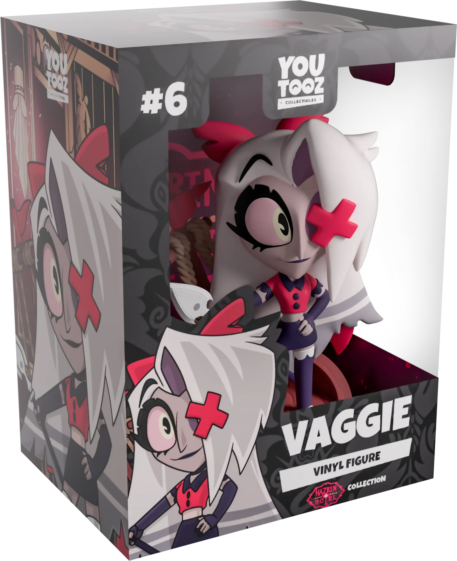 Vaggie volgde Charlie rechtstreeks naar YouTube om hem alle mogelijke steun te geven voor zijn debuut! Ze staat 14 cm hoog voor een scheepskraaiennest met een rood zeil dat wappert vanaf de top van de mast. In haar rechterhand houdt ze een lange speer, terwijl haar linkerhand op haar heup rust en een lange pony tot halverwege haar gezicht valt. Met een sluwe glimlach op haar gezicht, terwijl één enorm oog haar aanstaart en het andere is gemarkeerd met een rode "X", draagt ze een enorme strik achter op haar hoofd, een kort topje met kraag, een korte rok en arm- en beenwarmers. De buitenkant van haar verpakking doet denken aan de muren van een hotel met sierlijk goud tegen een dieprode achtergrond, terwijl de binnenkant een scheepskraaiennest afbeeldt tegen een paarse lucht. De beschermhoes onthult vervolgens de skyline van de stad met een donkerrood licht dat van de gebouwen schijnt, terwijl het silhouet ervan te zien is door het grote, doorzichtige venster aan de voorkant van de verpakking. Dit verzamelobject wordt geleverd in een beschermende matte, reliëfhoes en een op maat gemaakte plastic beschermhoes voor maximale bescherming tijdens de verzending.