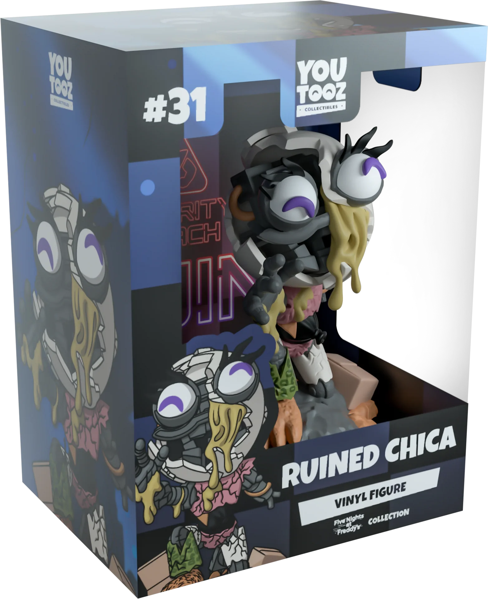 S'avançant avec une main métallique nue et tendue qui dégouline d'une mystérieuse substance jaune et mesurant 4,1 pouces de haut, la moitié de son visage brisé manque pour révéler un crâne en endosquelette froid qui suinte la même substance alors que ses yeux violets disjoints pointent dans des directions différentes. Il lui manque la majeure partie de son bras gauche et avec d'épaisses fissures sur ce qui reste d'un corps rose, vert et blanc, elle s'agenouille sur un tas de détritus avec un pied orange griffé dépassant vers l'extérieur. L'extérieur de son emballage voit Chica se diriger lentement vers vous dans un couloir de plus en plus petit. Tandis que l'intérieur est imprimé du logo néon « Frèche de sécurité » et recouvert d'un motif à carreaux bleu et noir qui se fraye un chemin sur la pochette de protection alors que sa silhouette peut être vue à travers la grande fenêtre d'affichage transparente située sur le devant. Cet objet de collection est livré dans une pochette extérieure de protection mate en relief et dans un protecteur en plastique de taille personnalisée pour une protection maximale pendant l'expédition.